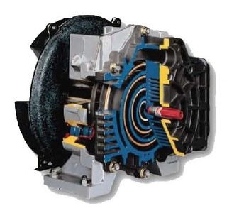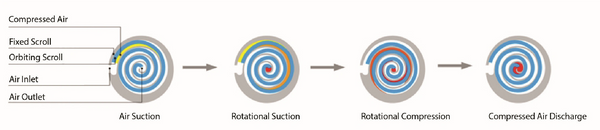 The airend has one orbiting scroll and one fixed scroll. The orbiting scroll is coupled to the crankshaft in orbit rather than rotated. The orbiting motion creates a series of air pockets traveling between the two scroll plates.